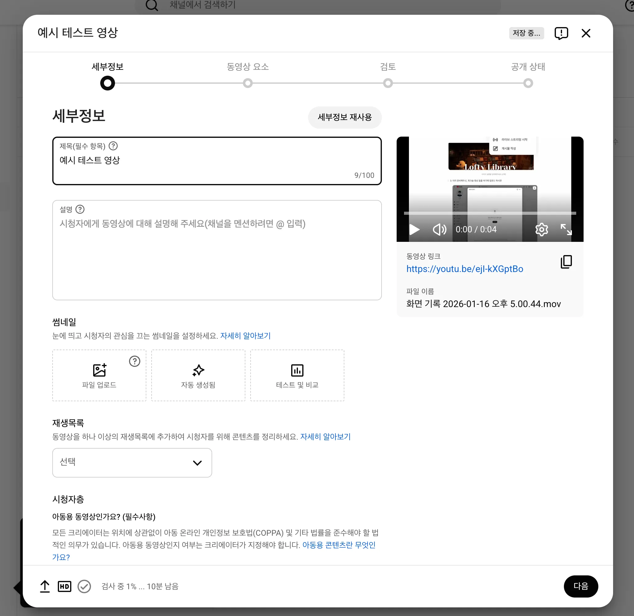 4. 영상 제목 / 설명을 모두 채워서 '다음' 버튼을 눌러 업로드를 완료합니다.