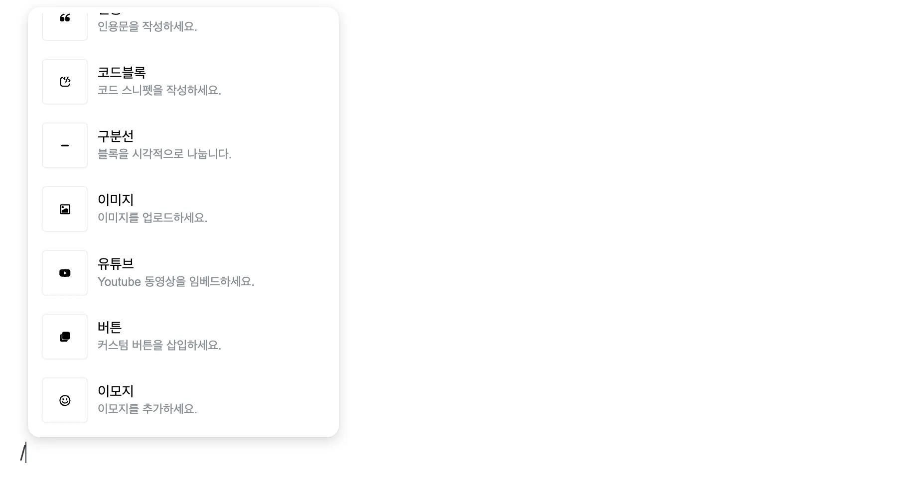 6. / (슬래쉬) 를 친후 '유튜브' 버튼을 클릭하면 유튜브 링크를 넣을 수 있습니다.